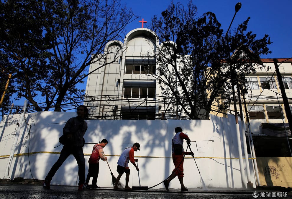 本周一,在發生自殺炸彈攻擊的其中一座教堂前,信徒們正忙著清理現場。