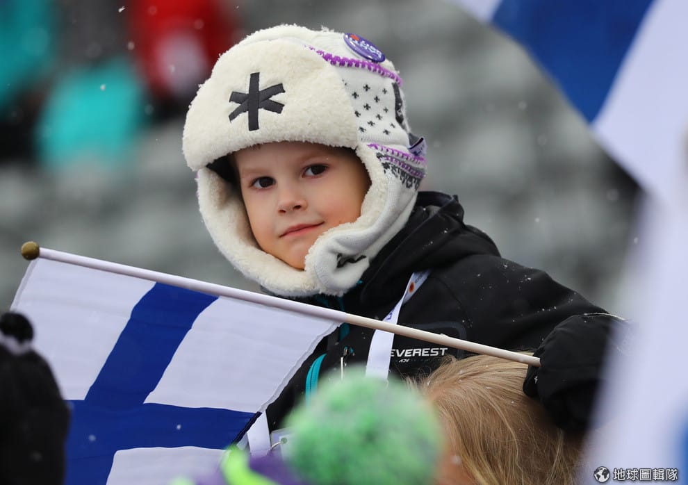 一名孩童手舉芬蘭國旗,為在場上參加滑雪比賽的選手加油。