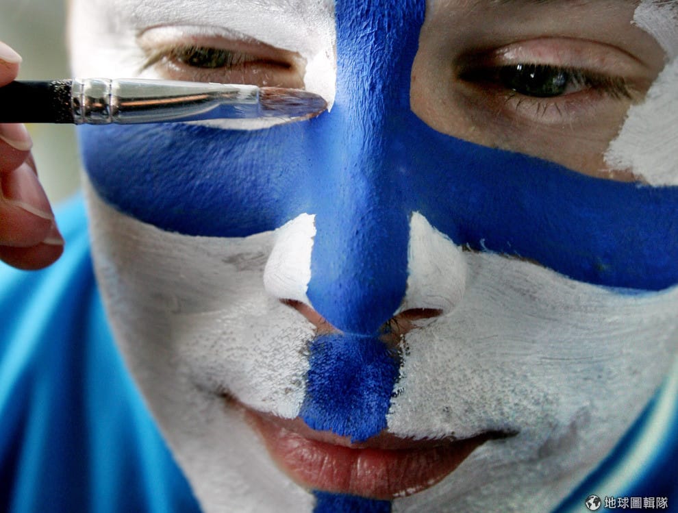 在 2006年國際冰上曲棍球比賽上,一名運動愛好者在面部畫上芬蘭國旗,表達對自己國家的支持。