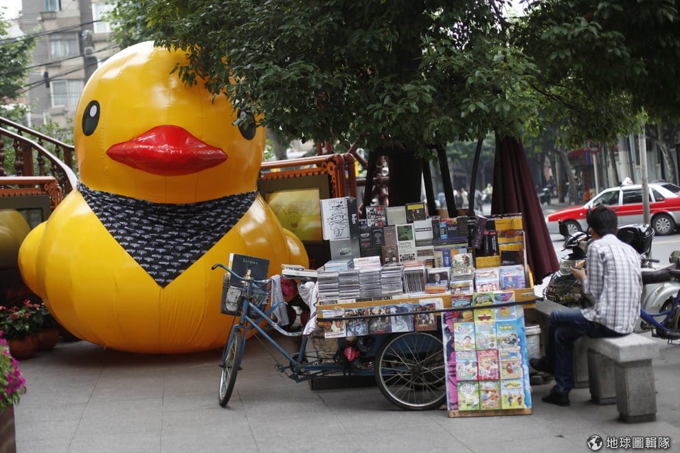 中型黃鴨現身在上海街頭,一旁的書報攤和行人全小了一號。