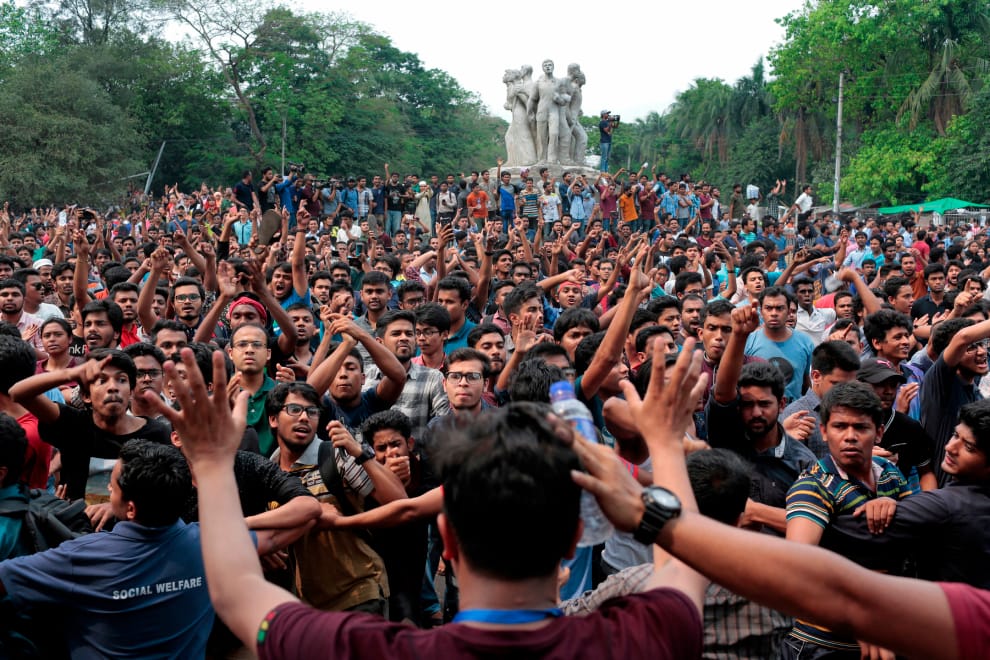 今年 2月起,有不少孟加拉的大學生們以靜坐的方式示威抗議,希望政府可以取消這些公職保障名額,使 90%的公職職缺由一般公職考試遴選。上個月 8號,約有 5萬名孟加拉大學生走上街頭抗議,一度爆發警民衝突,至少 163人因此受傷。