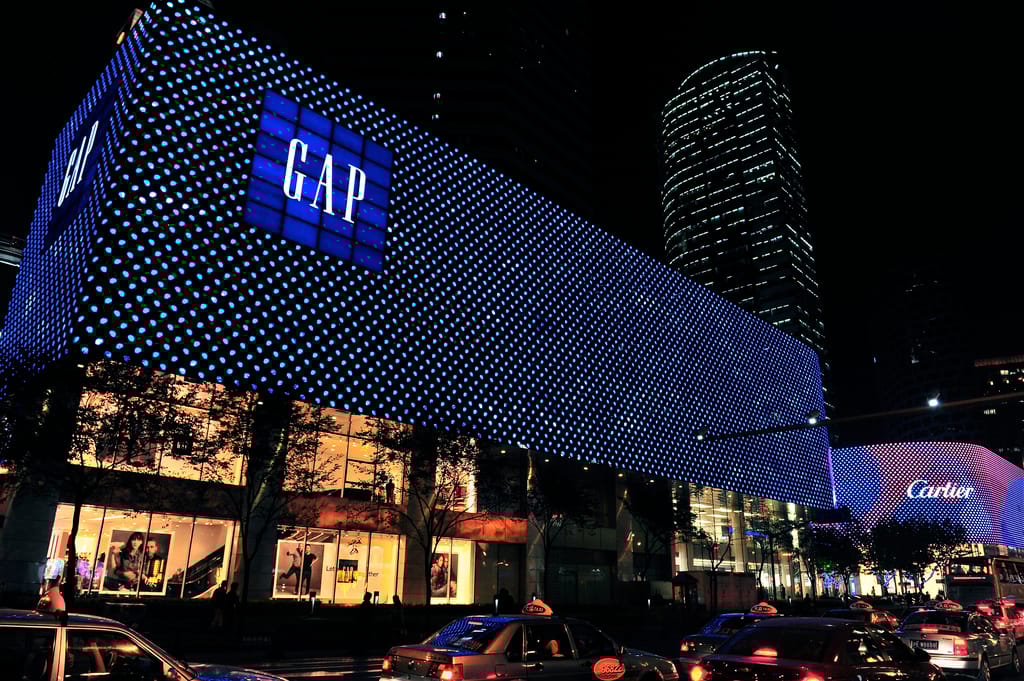 在車水馬龍的上海香港廣場,Gap分店在黑夜中亮著藍燈,格外引人注目。