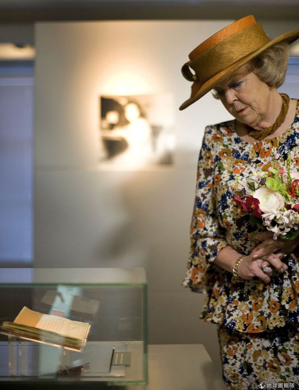 圖為 2010年4月,時為荷蘭女王的碧雅翠絲(Beatrix,現已退位)在安妮法蘭克之家,閱讀著《安妮日記》原稿。