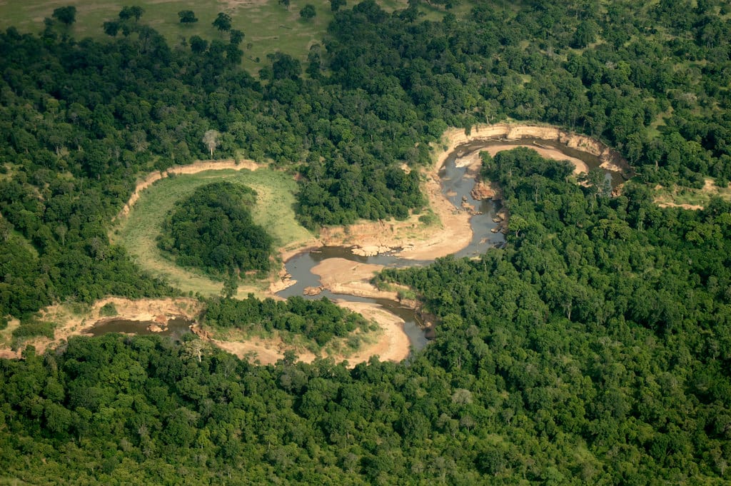 從高空中可以看到蜿蜒的馬拉河。馬拉河有「非洲血河」之稱,在豐水期時會形成急流,阻礙野生動物渡河,不時會有動物在渡河時淹死。