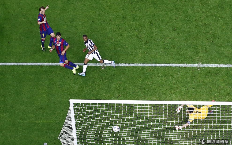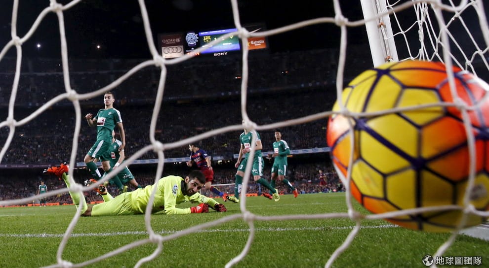 在 2015年6月的比賽中,屬巴塞隆納足球俱樂部球員的蘇亞雷斯(左二)成功地射門得分。