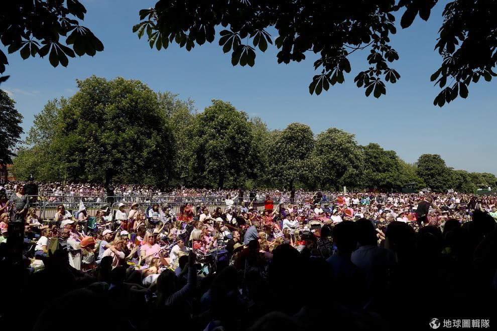 「那個入鏡的英國國旗是來自王室成員的粉絲。他為了這一刻已經在這裡紮營了好幾天,(對我來說,)那面入鏡的旗子是讓照片能夠獨一無二的小驚喜。」