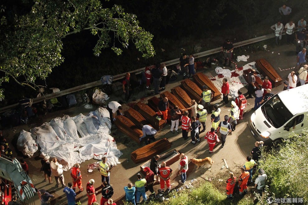 義大利當地28號晚間,一輛前往那不勒斯的客運從高架橋上翻落,目前已知至少有36人不幸喪生,事故現場滿是救難人員,由於客運墜落在充滿樹叢的地點,增加救援困難