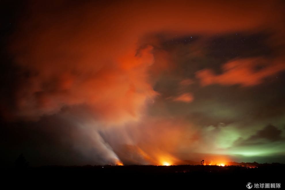 在本月 15號傍晚,三條岩漿裂縫同時發生噴發,替天空帶來了紅綠交雜的色彩。