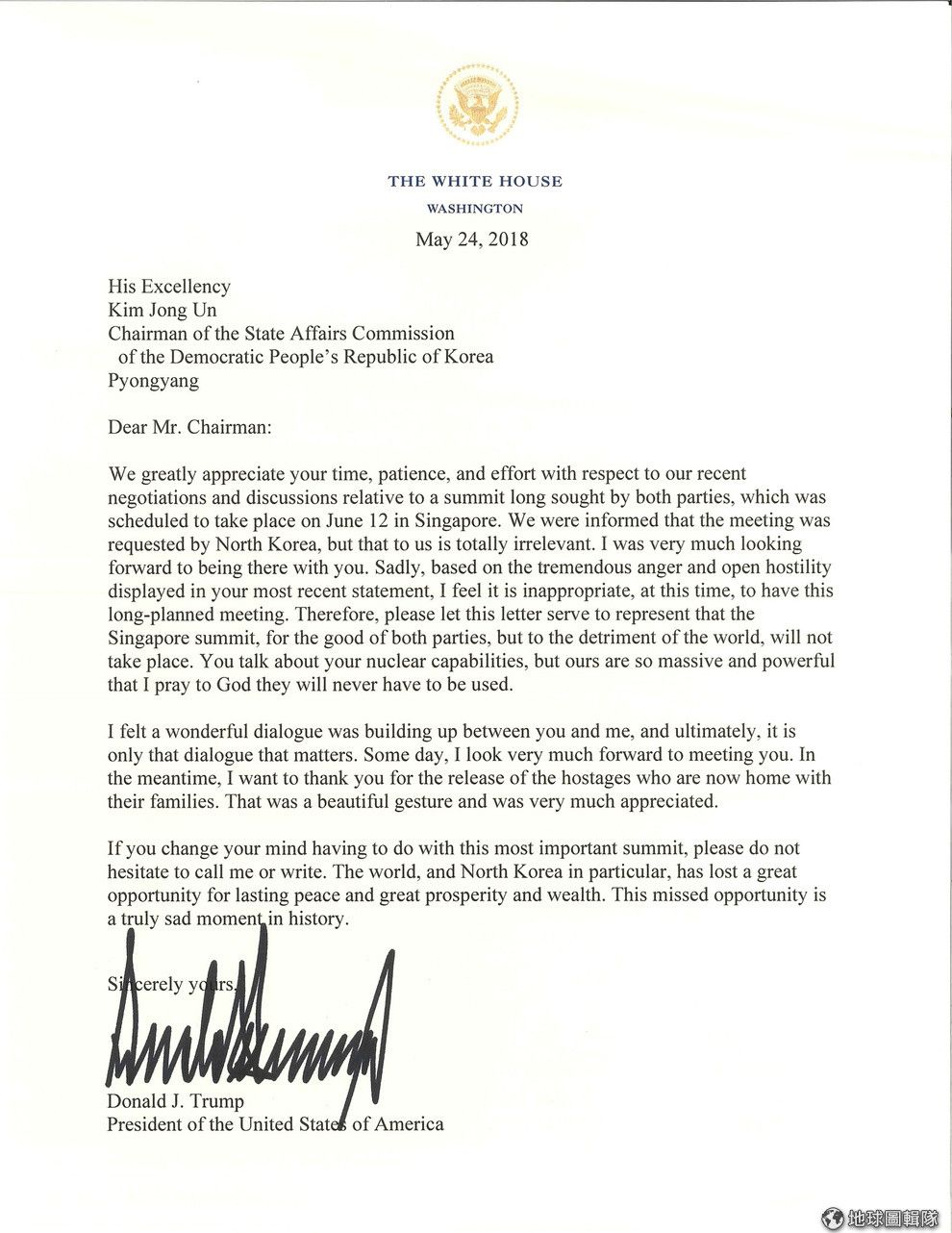 圖為白宮發表致北韓領導人金正恩的公開信全文。一名資深官員相信,北韓一連串「違背諾言」的行為顯示他們對即將到來的會議「嚴重缺乏誠意」,才會讓他們決定取消會談。