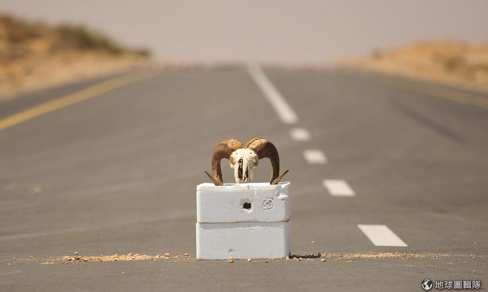 在2011年9月的利比亞,反格達費政權勢力以羊頭骨頭標示戰事前線所在處。