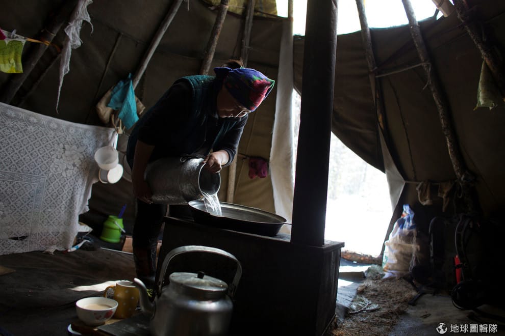 路透社芒克巴特(Baigalmaa Munkhbat)在帳篷中幫一家人準備餐點。圖哈人的飲食主要是肉類搭配由麵粉做成的主食,有時吃起來像水餃或是義大利麵。