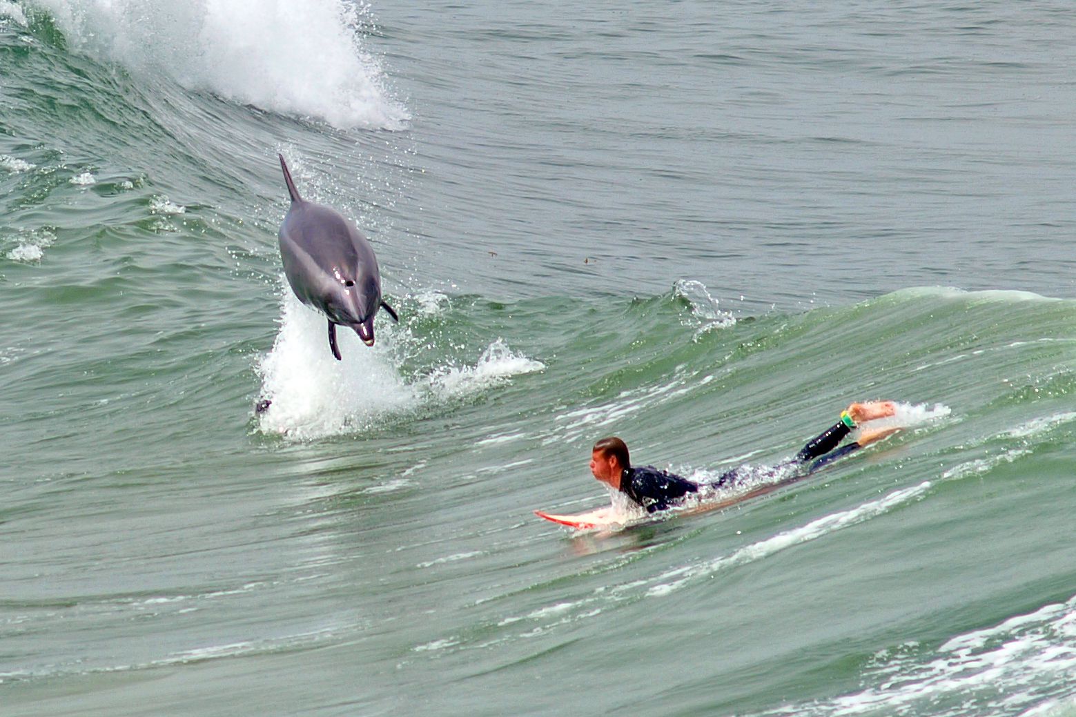 圖為一隻和衝浪客一塊衝浪的野生海豚。究竟圈養海豚好不好,一直是個充滿爭議的問題。