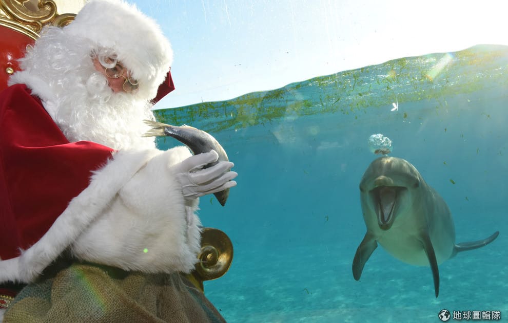 在海洋公園內,一隻在泳池中的海豚直勾勾地望著聖誕老人手上的鮮魚。