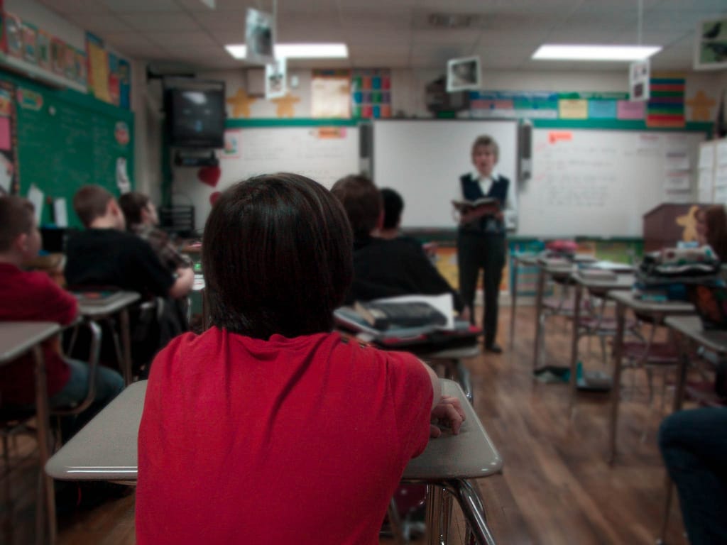 圖為一名穿著紅色T恤的學生,坐在位子上聽老師講課。研究團隊發現,只要上課日的氣溫高華氏 1度F,就會讓學生的成績掉 1%。