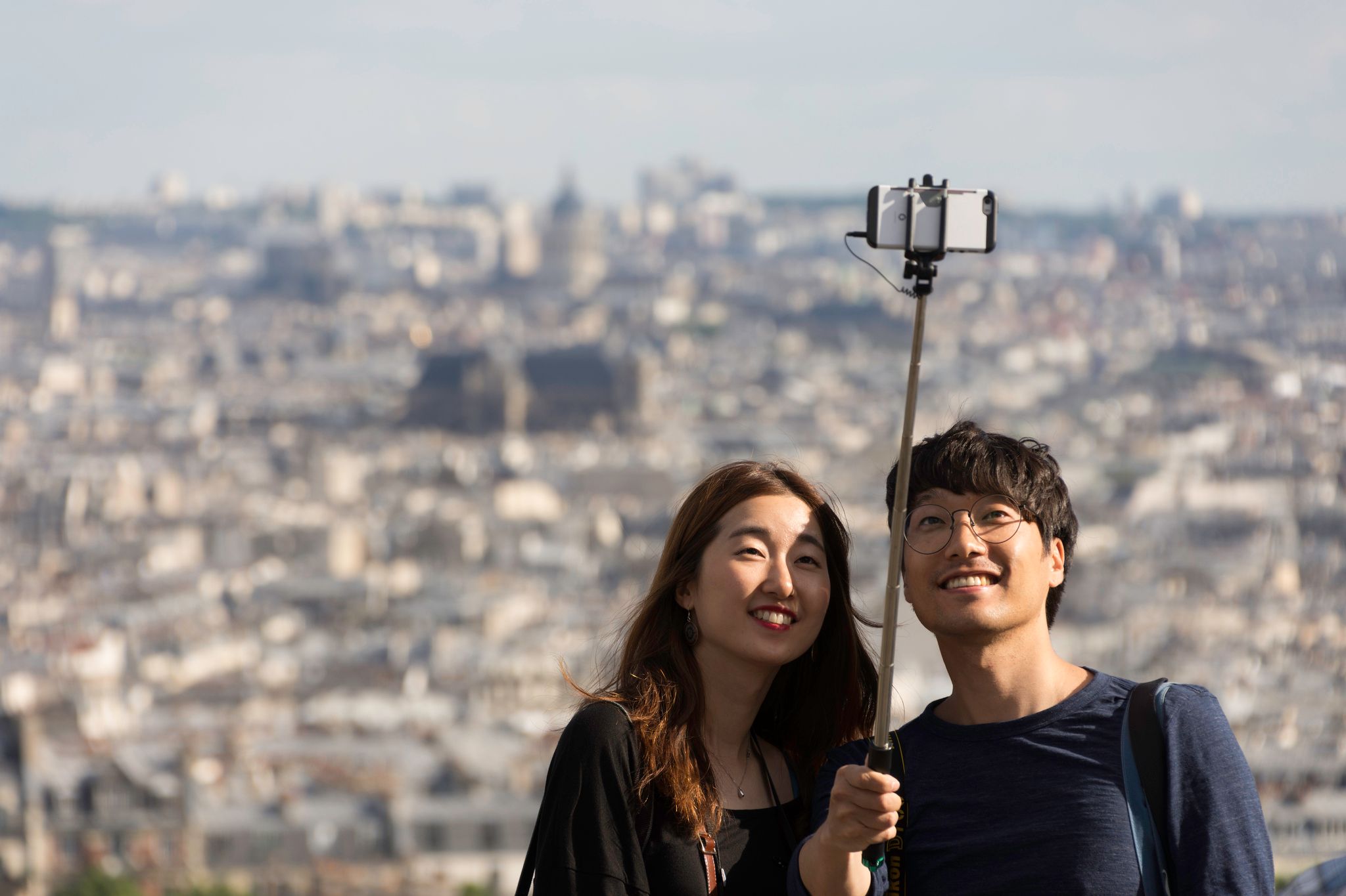 圖為法國巴黎(Paris)的蒙馬特(Montmartre),有兩名遊客開心地自拍。