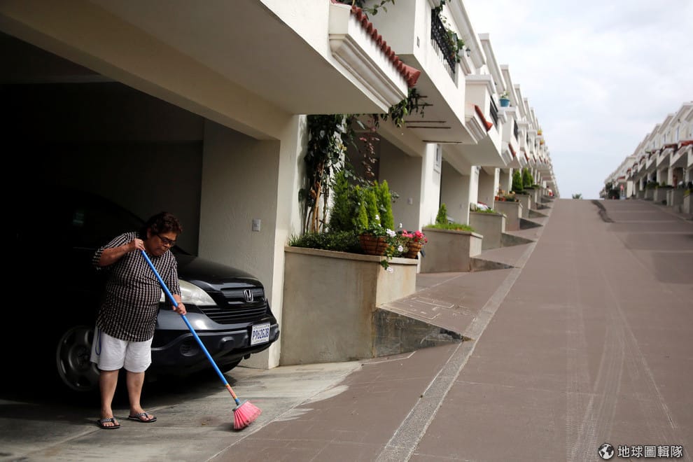 一名女子清掃著受到火山爆發波及的家門,整條馬路都蒙上了一層厚厚的灰。