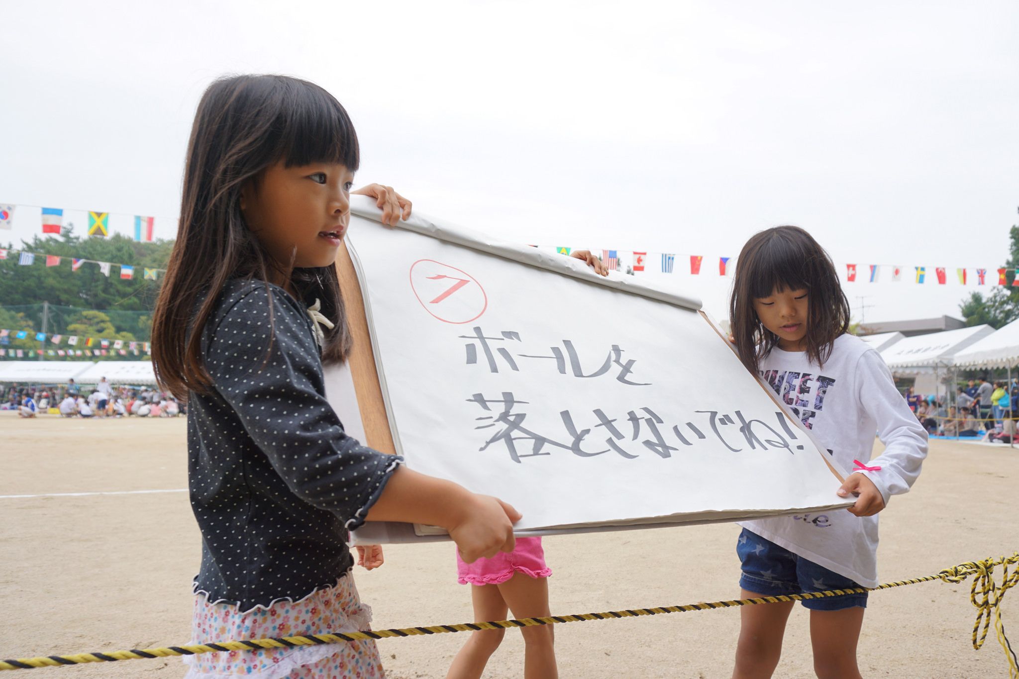 圖為 2015年10月體育之日的地方運動會上,兩名女生舉著板子繞場提醒第七場比賽的參賽者,該到大會進行檢錄。