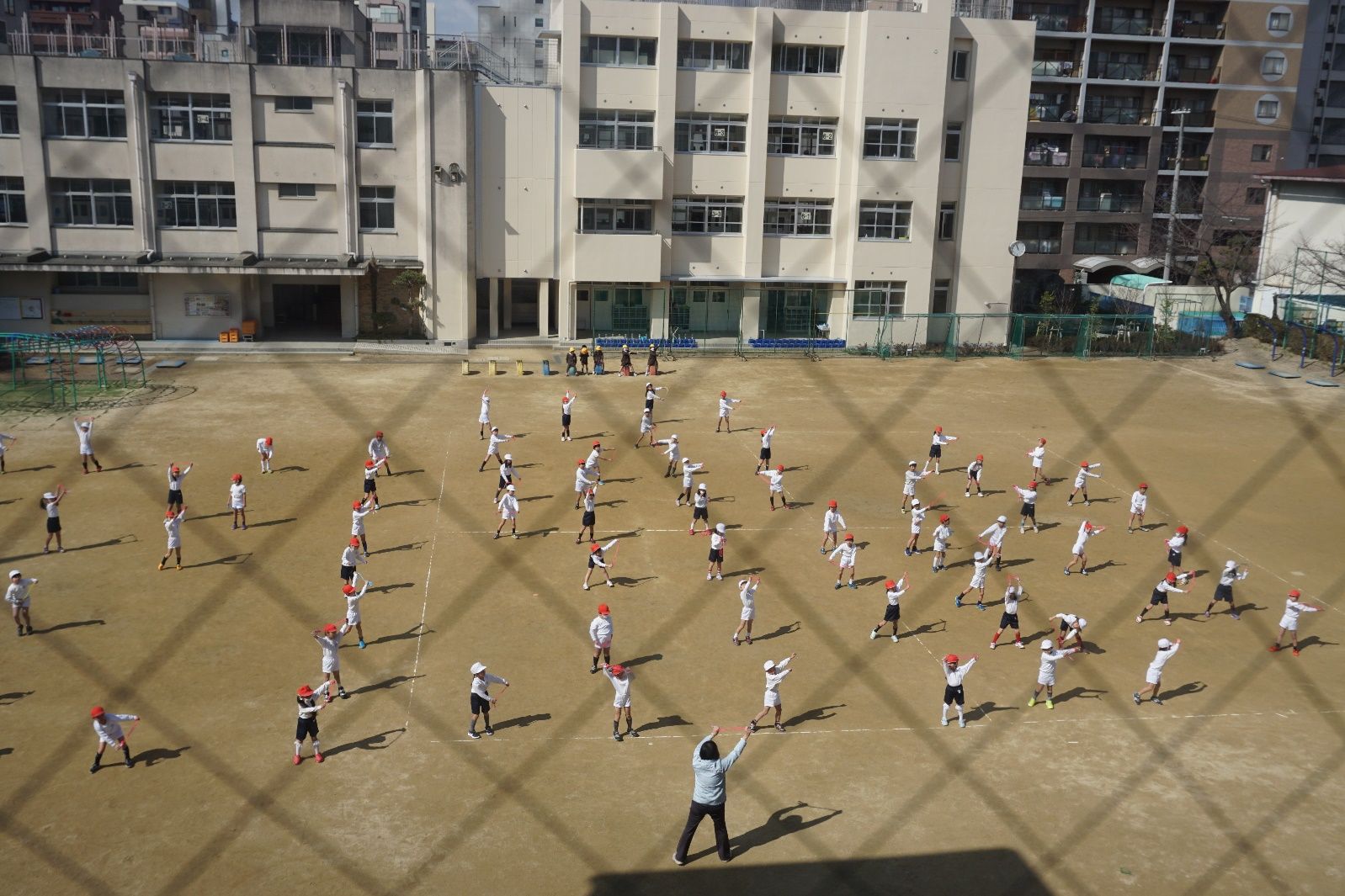 圖為日本大阪堀江小學體育課上課一景,學生們正在操場做伸展操。