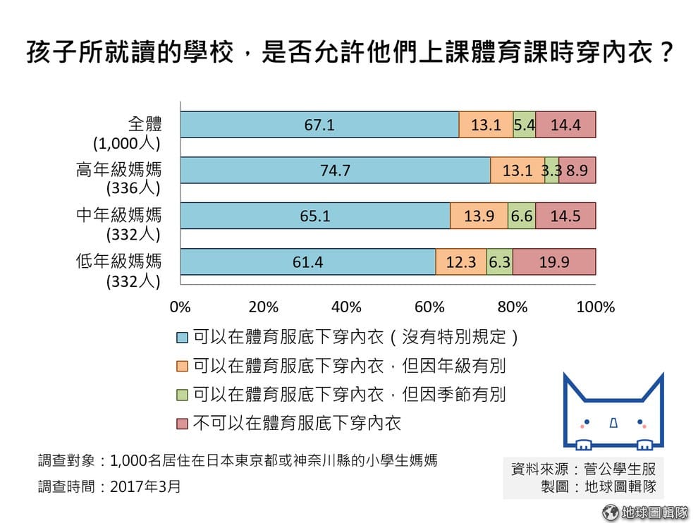 圖為去年 3月,菅公學生服的問卷調查統計。有 14.4%的小學生媽媽表示,孩子所就讀的學校禁止學生在體育課時穿內衣。