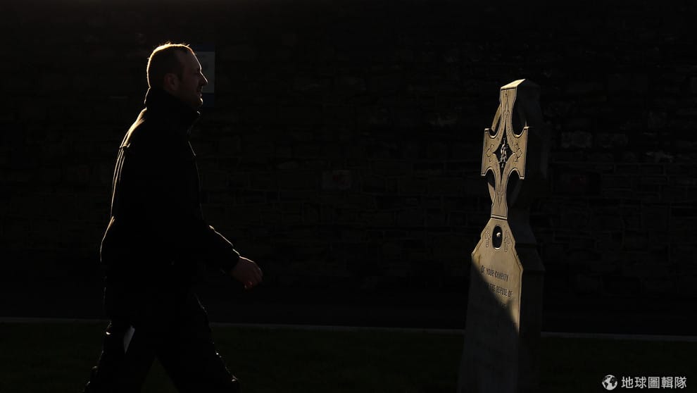 在都柏林格拉斯涅文公墓(Glasnevin Cemetery),一名男子走過紀念「抹大拉洗衣房」受難女性的紀念碑。