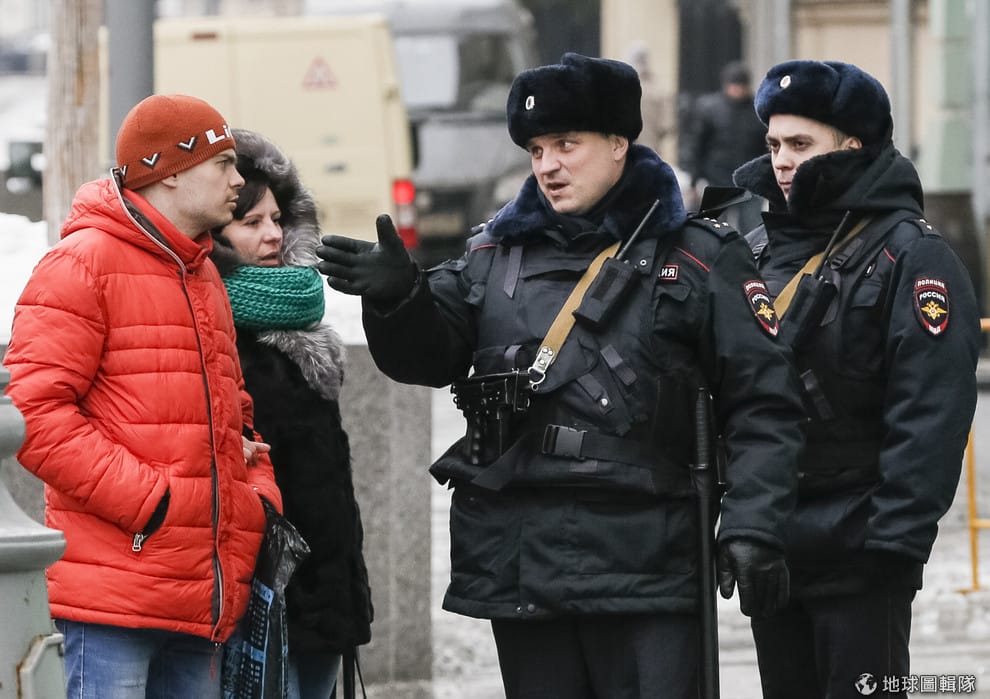 2018年3月在莫斯科,兩名警察正在替行人指路。