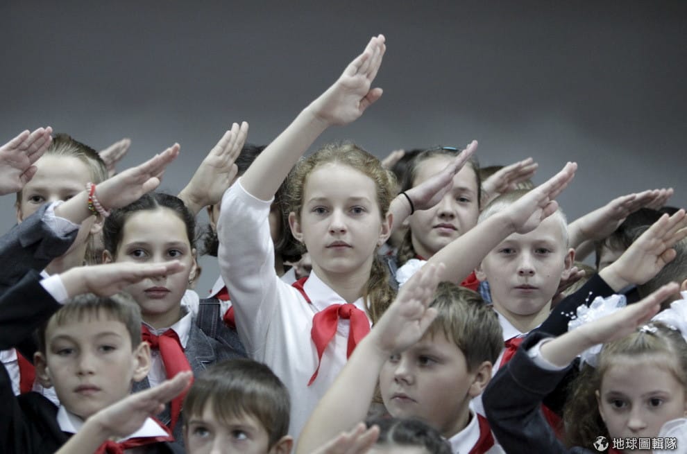 在俄國,任意微笑反而會激起人們的防備心,甚至是敵意。圖為 2015年11月,18名新生繫上紅色領結,在始業式這天舉手向前蘇聯時期的少年先鋒組織致敬。在蘇聯解體後,這項儀式已經少有教育機構保留。
