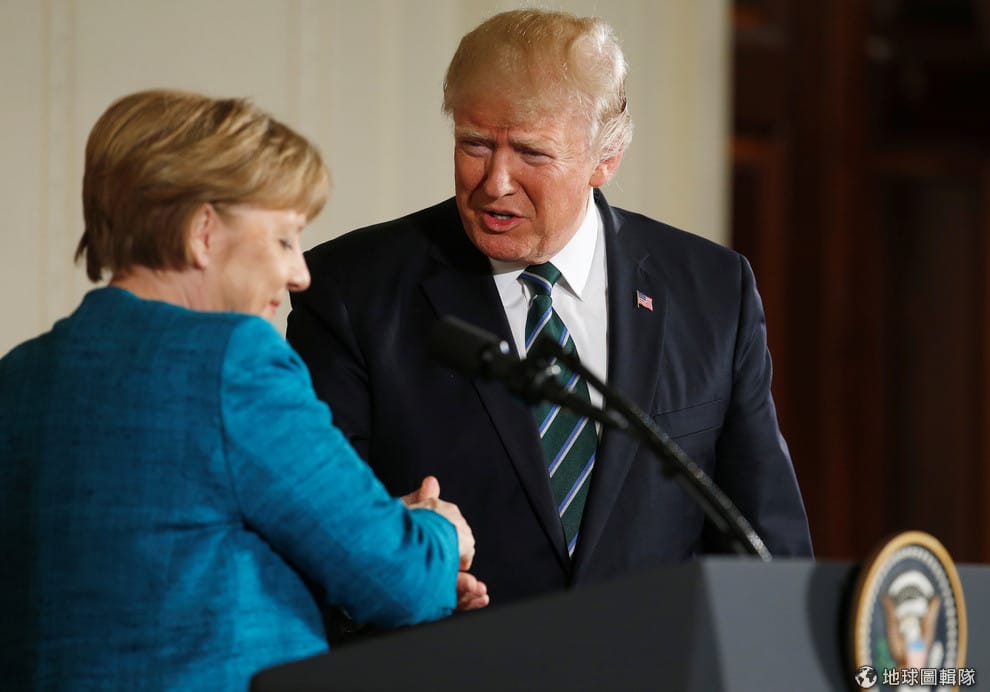 2017年3月17日,川普在白宮東廂辦公室的美德聯合記者會上,伸出手和德國總理梅克爾(Angela Merkel)握手。