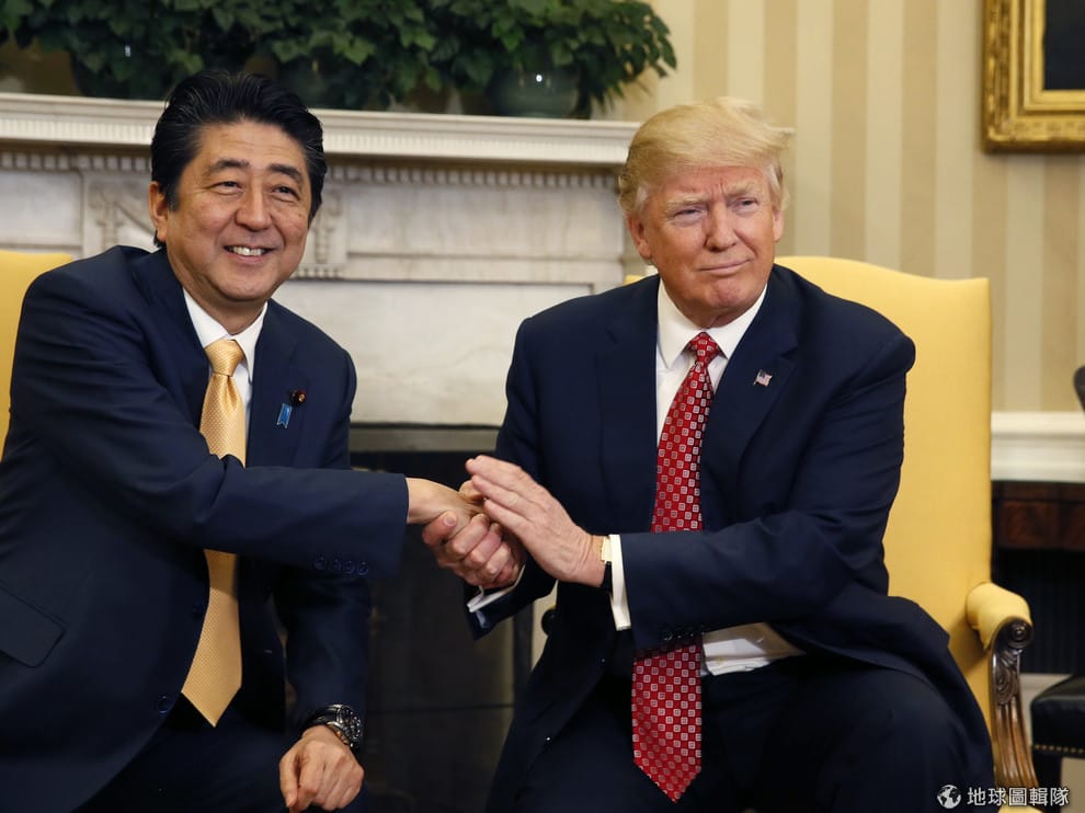 2017年2月10日,日本首相安倍晉三出訪美國,川普在白宮橢圓形辦公室好好地握住並輕拍安倍晉三的手。