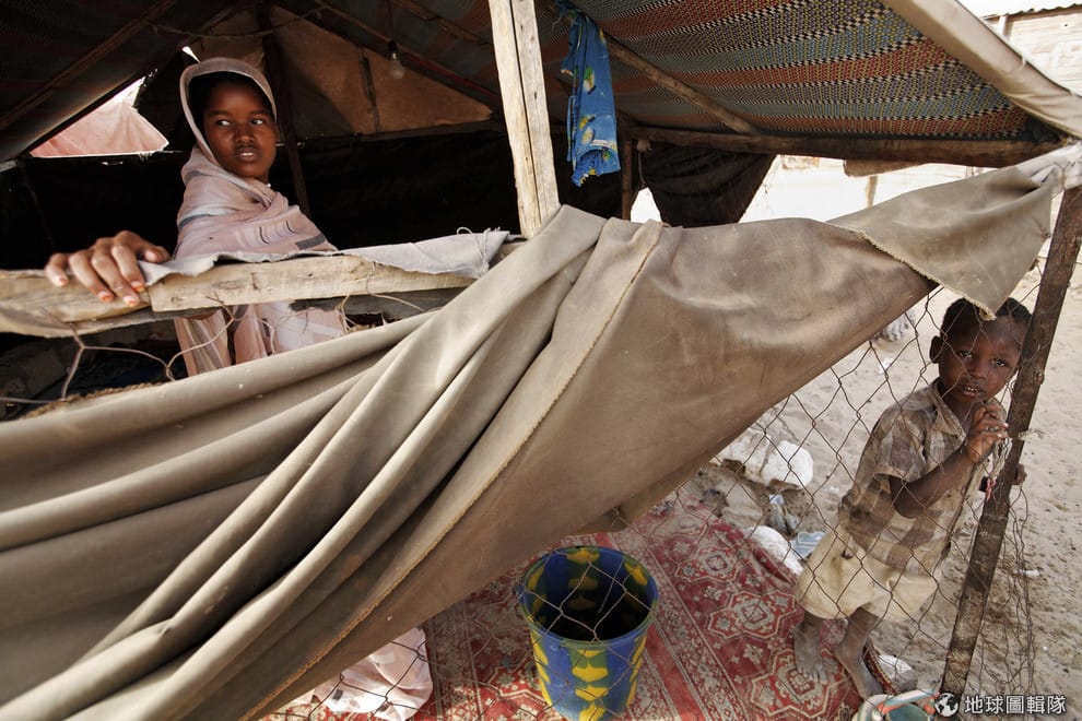 圖為 2007年3月,在茅利塔尼亞首都諾克少附近的貧民窟,一名婦女和兒童在臨時庇護所裡站著。