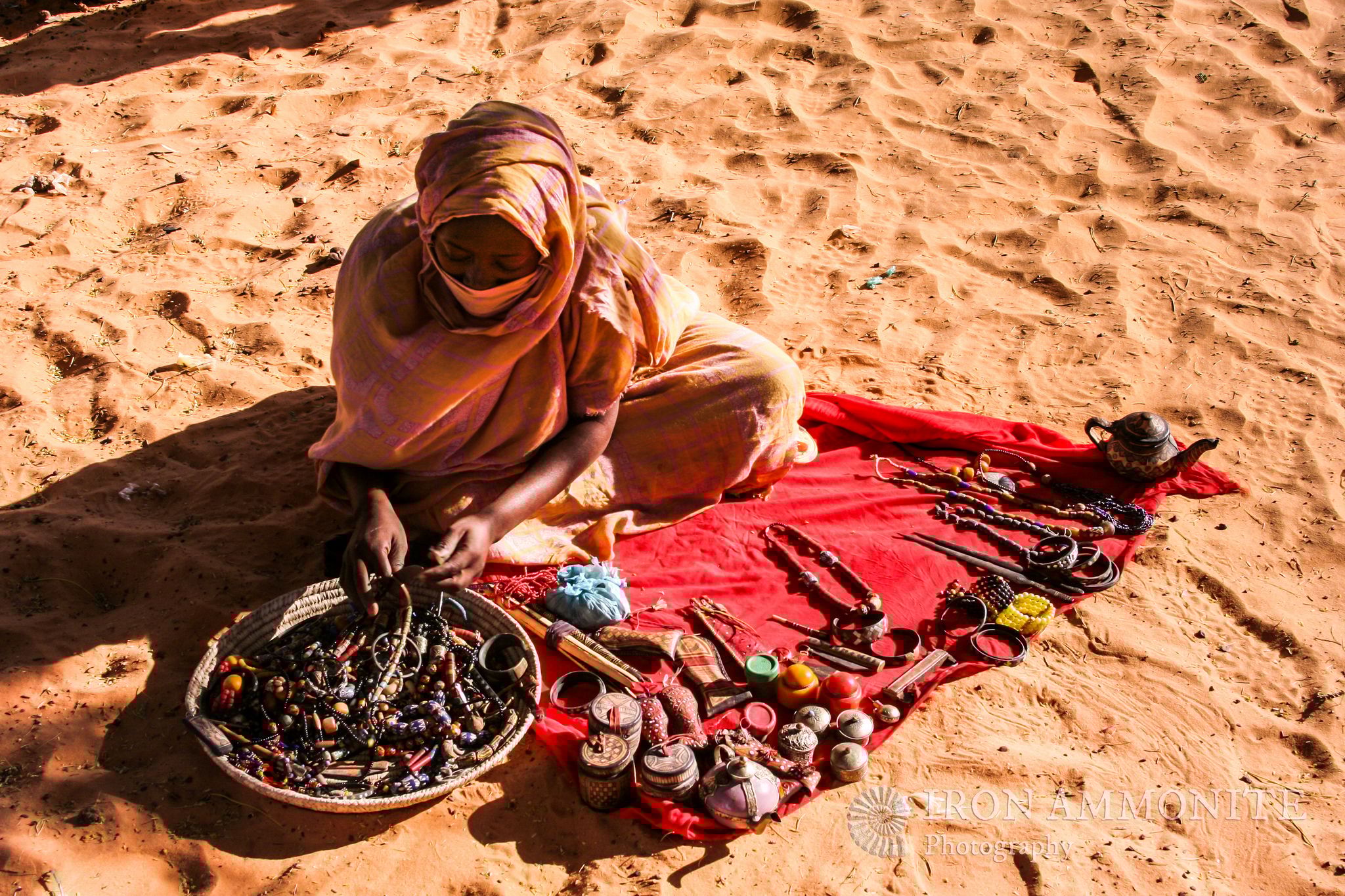 圖為茅利塔尼亞境內的撒哈拉沙漠地區,有一名婦女在地上擺攤販售飾品。