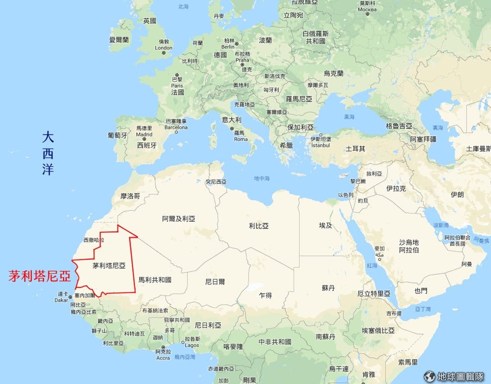 圖為茅利塔尼亞的地理相對位置,茅利塔尼亞介在北非阿拉伯馬格里布(Maghreb)地區和撒哈拉沙漠之間,除了說阿拉伯語的柏柏人之外,還有哈拉廷人等和非裔茅利塔尼亞人。