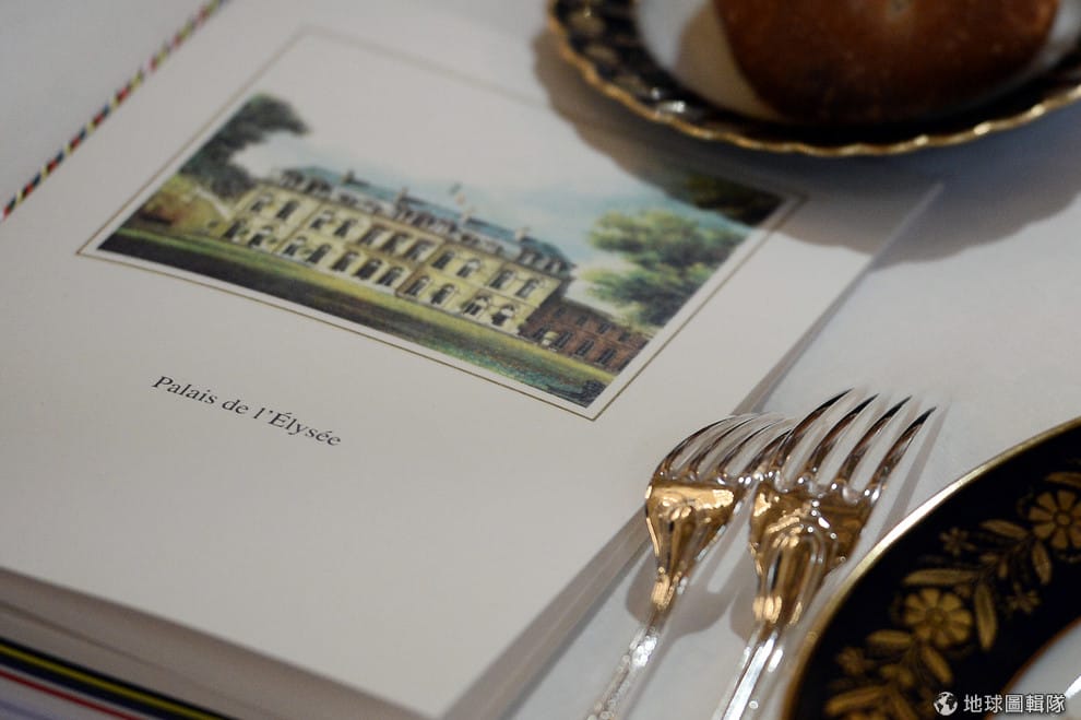 2016年,法國總統府愛麗舍宮舉辦國宴款待南非總統,桌上擺放了精緻的餐盤、餐具和菜單。