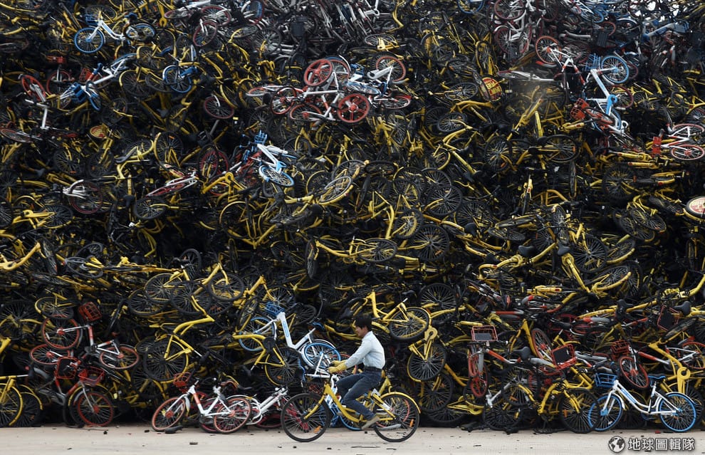 2017年12月,在福建省廈門市,一名工人騎著共享單車經過身後成堆的廢棄共享單車。