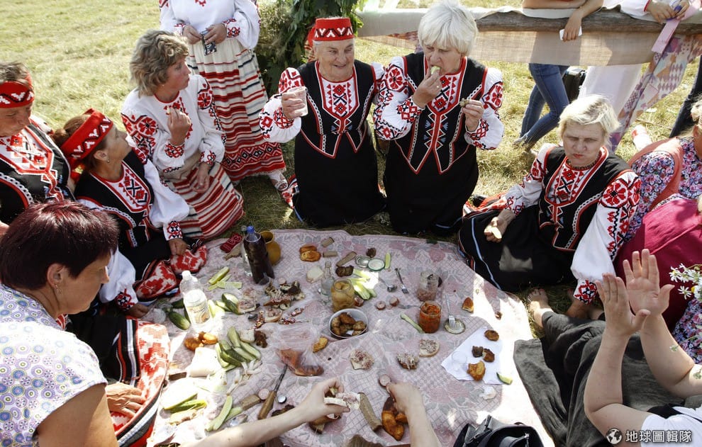 白羅斯的居民穿上傳統服飾,開心地喝著伏特加聊天。