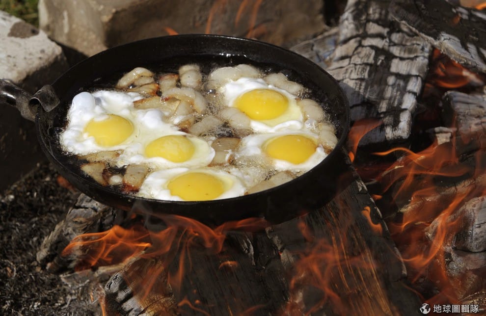 路透社白羅斯居民在火上煎著肥美的培根和雞蛋。