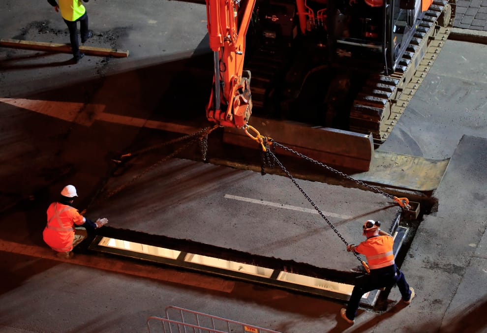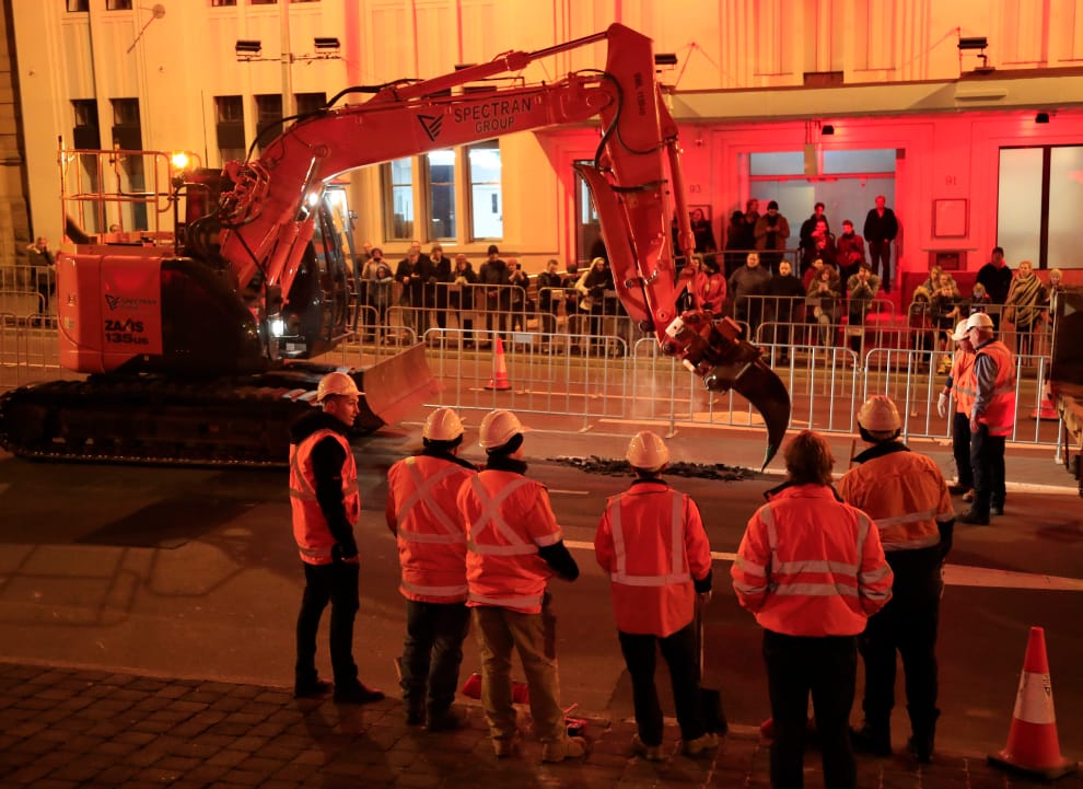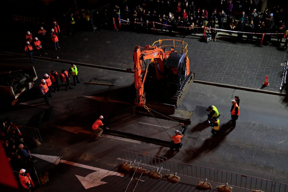 歐新社 / 達志影像經過兩個小時的開挖工作後,工作人員才順利在柏油路上挖出一個洞。