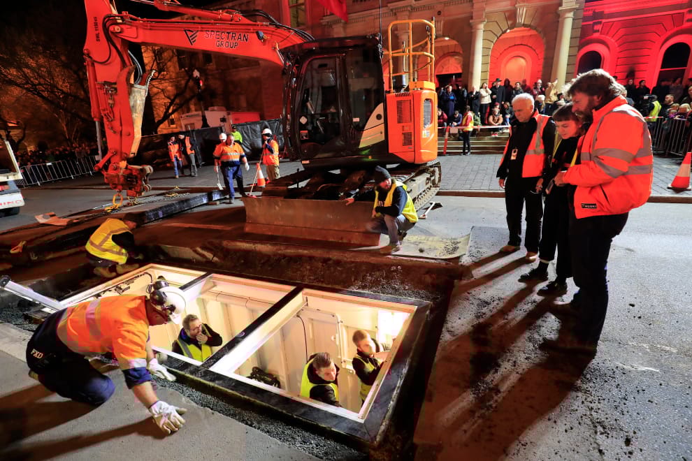 周日(17)晚上,在澳洲塔斯馬尼亞州(Tasmania)荷巴特(Hobart)市中心的麥格理街(Macquarie Street)上,超過 1,000名的民眾冒著嚴寒盯著地上看──工作人員花了 2個小時在柏油路面上挖開一個洞,並在洞裡放入一把梯子之後,73歲的帕爾(Mike Parr)從地底爬了出來。