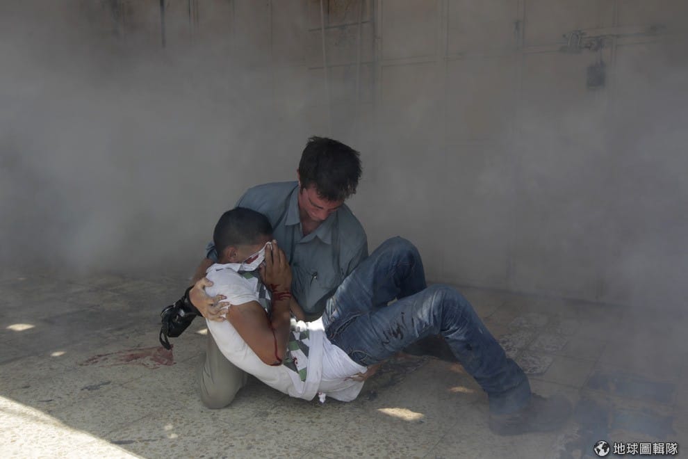 在巴勒斯坦,一名記者試圖把受催淚彈擊中臉的年輕人抬到一旁,當地的以色列軍隊和巴勒斯坦人時常發生嚴重衝突。