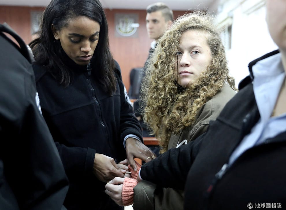 圖為今年 1月3日,在以色列拉姆安拉(Ramallah)的歐佛監獄(Ofer Prison)中,賞以色列軍人巴掌的少女塔咪米(Ahed Tamimi)在以色列監獄服務人員的護送下,抵達軍事法庭準備接受審判。