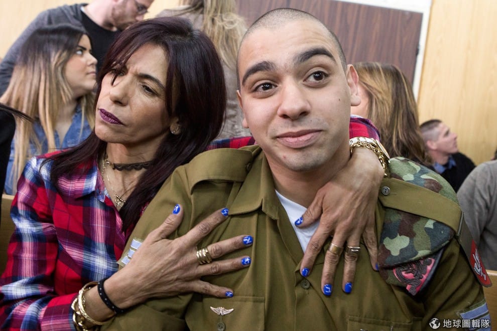 圖為 2017年3月21日,以色列士兵薩里亞在特拉維夫(Tel Aviv)的軍事法庭接受審判,坐在一旁的是他的母親。薩里亞在服刑 14個月後,已於今年 5月獲釋。