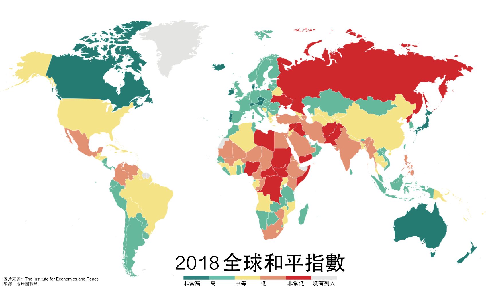 圖即為 2018年的全球和平指數。在 163個國家中,台灣排名第 34名。