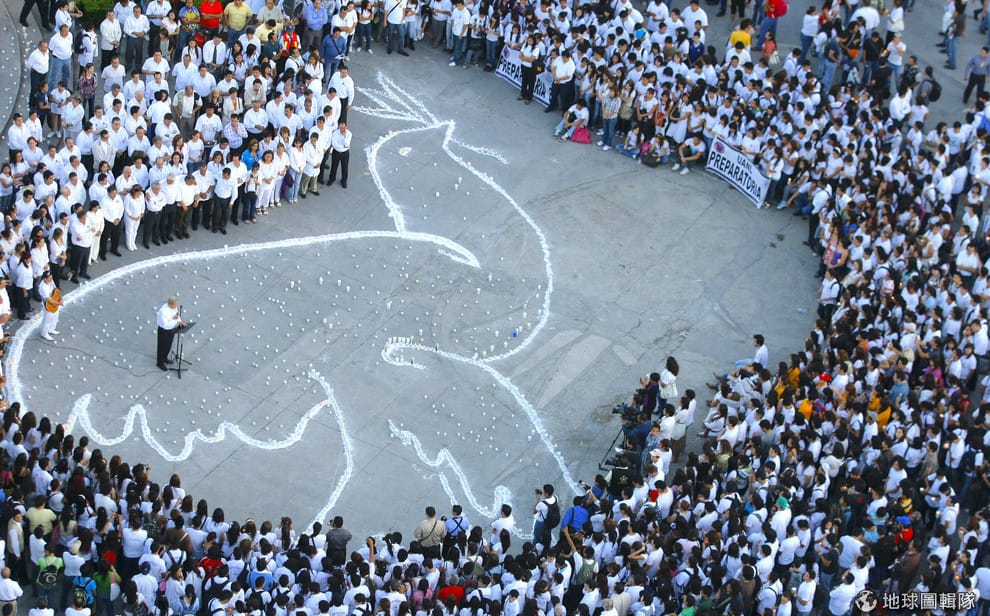 2010年10月在墨西哥,人們用蠟燭排出了鴿子的形狀,表達出他們對和平的渴望。