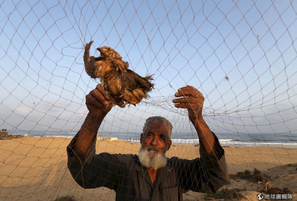 在巴勒斯坦,一名捕鳥人將卡在網子上的鵪鶉抓下來。