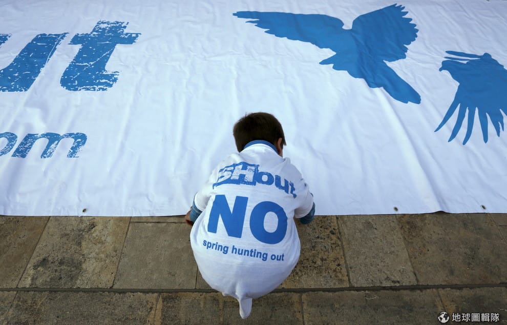 2015年4月,一名小男孩穿上寫有「春季打獵不要來」字樣的衣服,和其他民眾在首都瓦萊塔(Valletta)抗議獵人在春季獵捕鳥類。