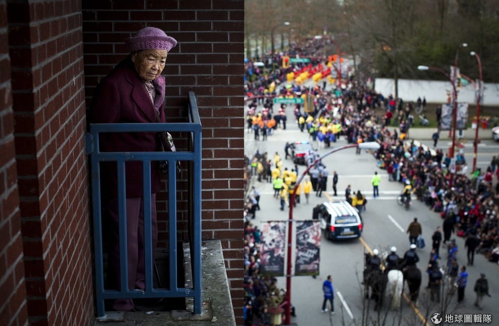 圖為 2015年2月,在加拿大溫哥華,一名高齡 90歲的奶奶站在陽台看著大街上熱鬧非凡的農曆新年遊行。