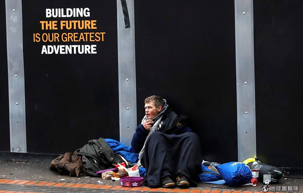 圖為 2017年12月,在英國伯明罕(Birmingham),一名男子在路邊乞討。