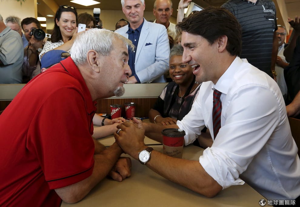 圖為 2015年10月,加拿大魁北克省(Quebec)的一間Tim Hortons門市,加拿大總理杜魯道(右)正在和民眾比腕力。