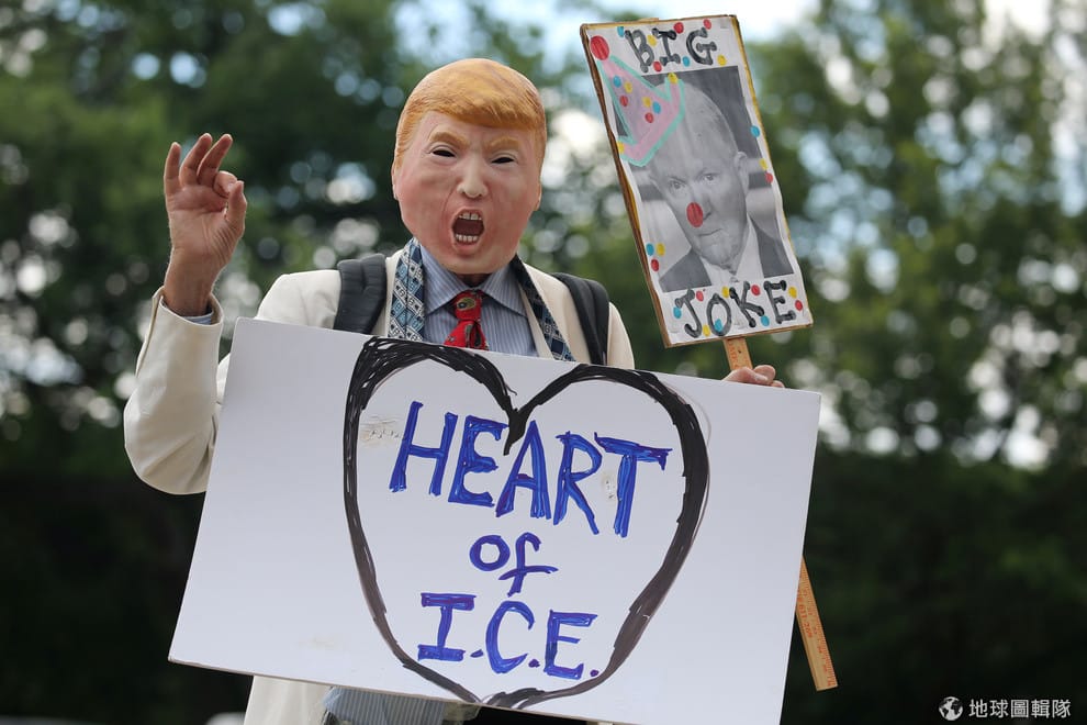 反對川普移民政策的民眾打扮成他的模樣,身體前方擺著控訴他冷血無情的海報。奧布拉多曾批評川普的移民政策「不負責任」。