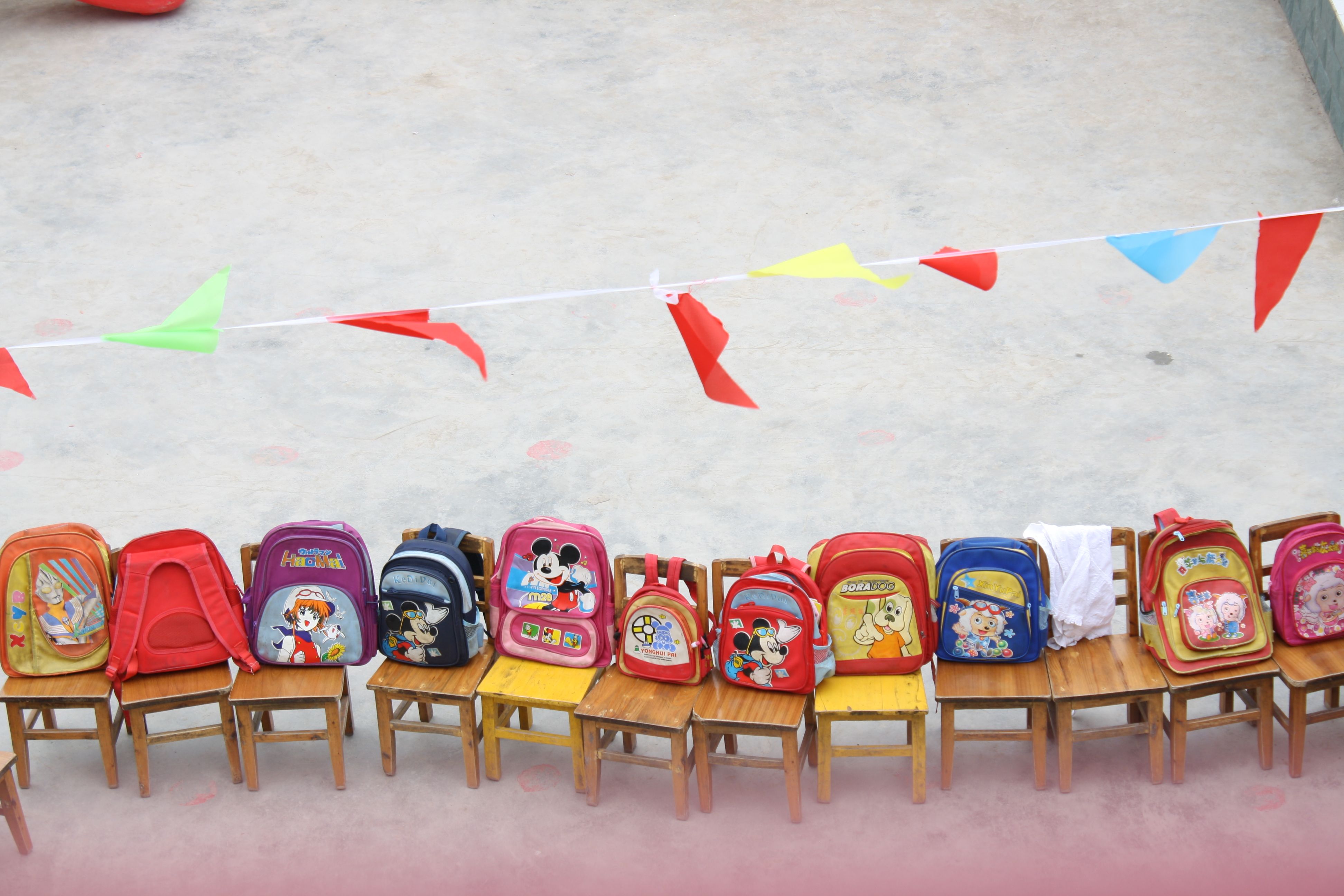 圖中可以看到被擺在長椅旁的不是鮮花,而是一個個的背包。