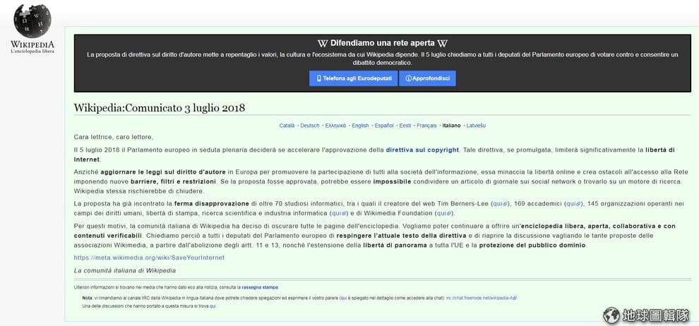 這兩天,如果進到《維基百科》的義大利文版網頁,你會發現《維基百科》的網站上寫著:《維基百科》很有可能會因為新的歐盟著作權法令而關閉。